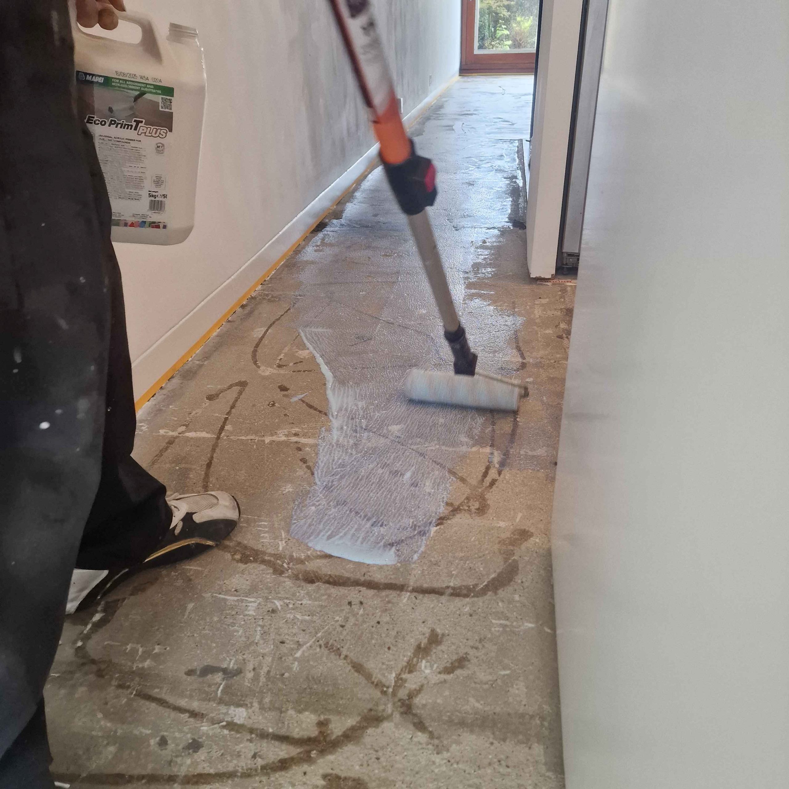 Once we’d achieved that flawless base, we primed the concrete thoroughly. Priming is absolutely crucial for glue-down installations – it seals the concrete, prevents moisture issues, and ensures the adhesive bonds properly. We then carefully laid out the cork tiles, planning the layout to minimize waste whilst ensuring the beautiful natural patterns flowed aesthetically through the space.