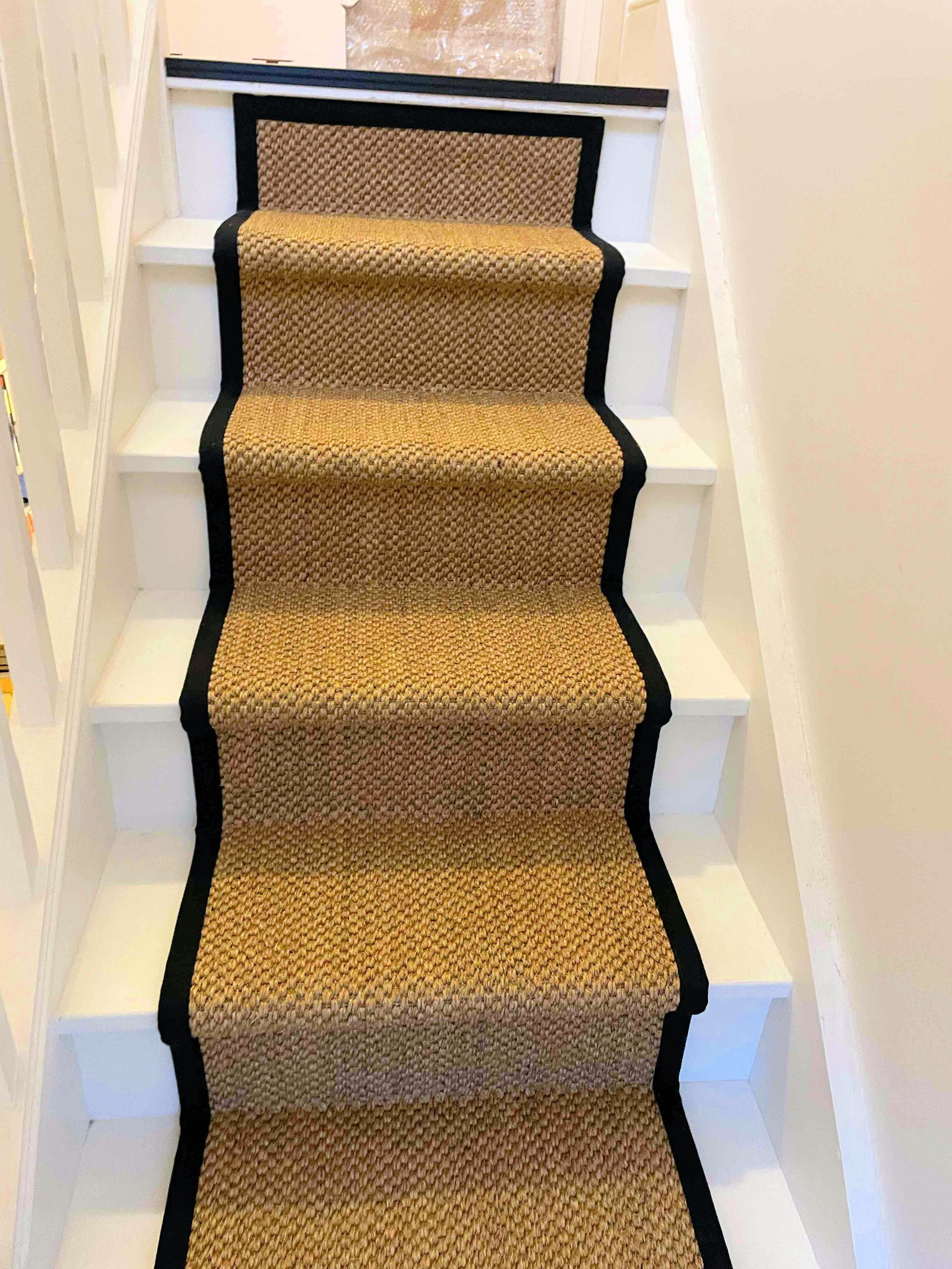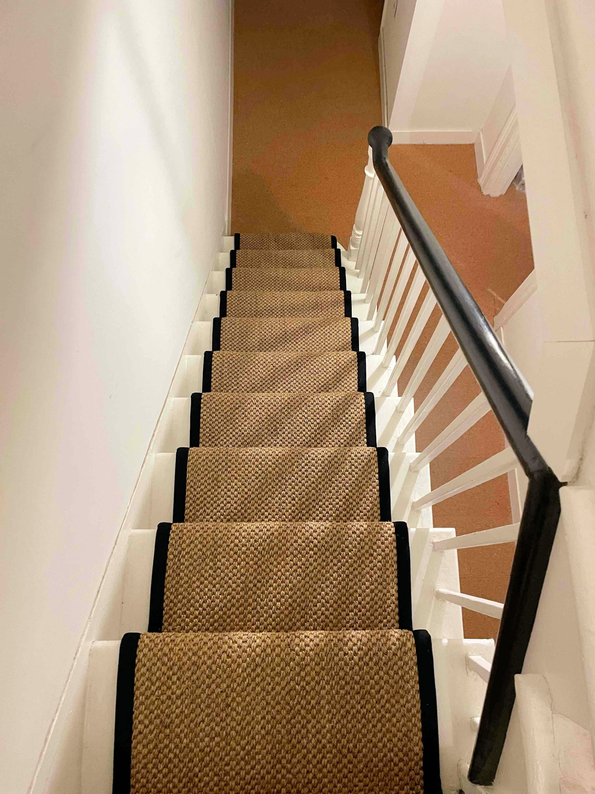 To frame the Tiger’s Eye, we finished the edges with a bespoke cotton piping. This gave the runner a tailored, “suit-and-tie” finish. The dark border contrasted beautifully with the golden hues of the sisal and the fresh off-white paint of the staircase.